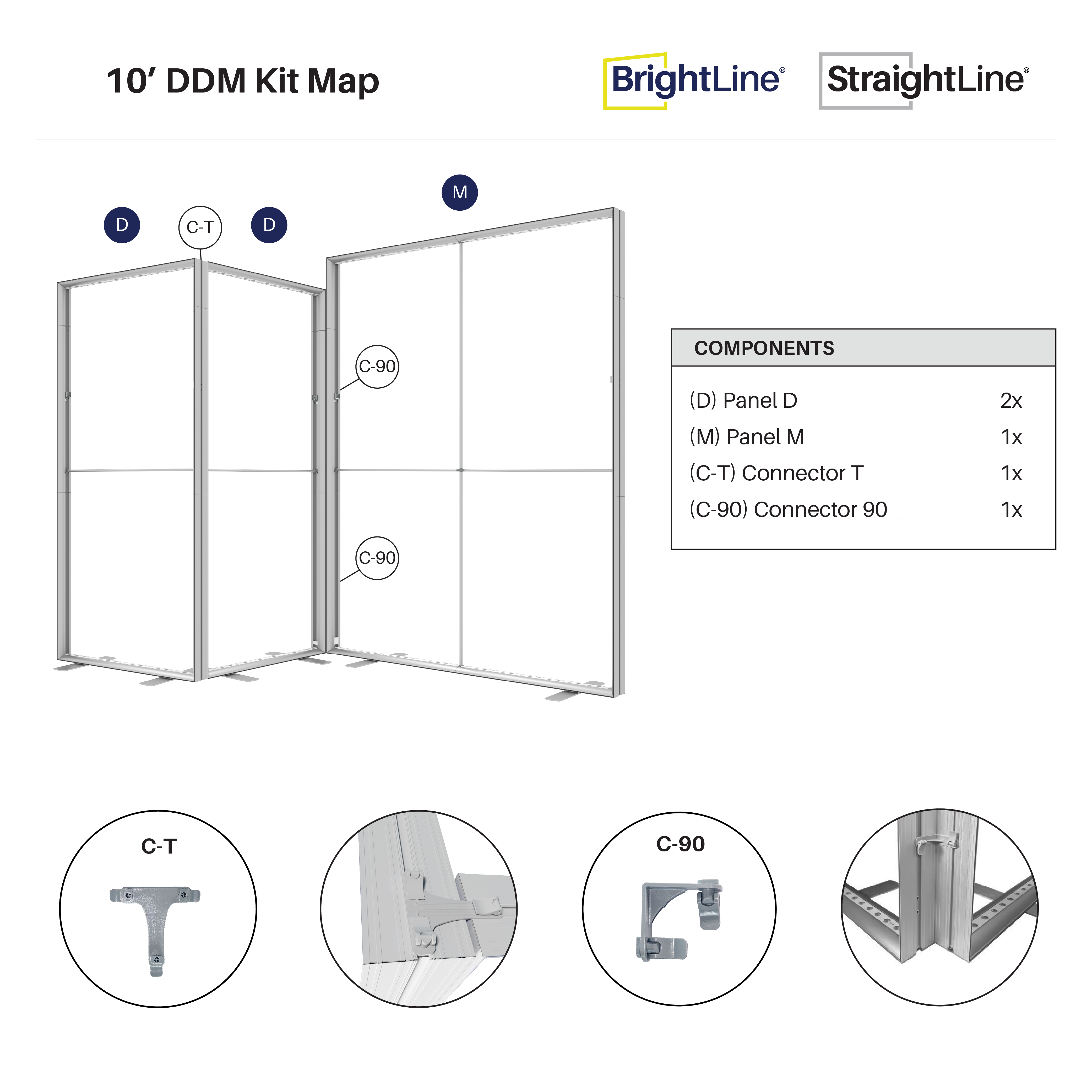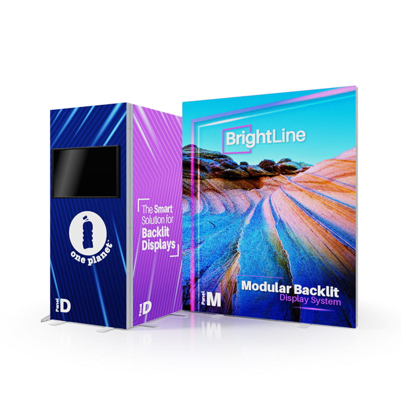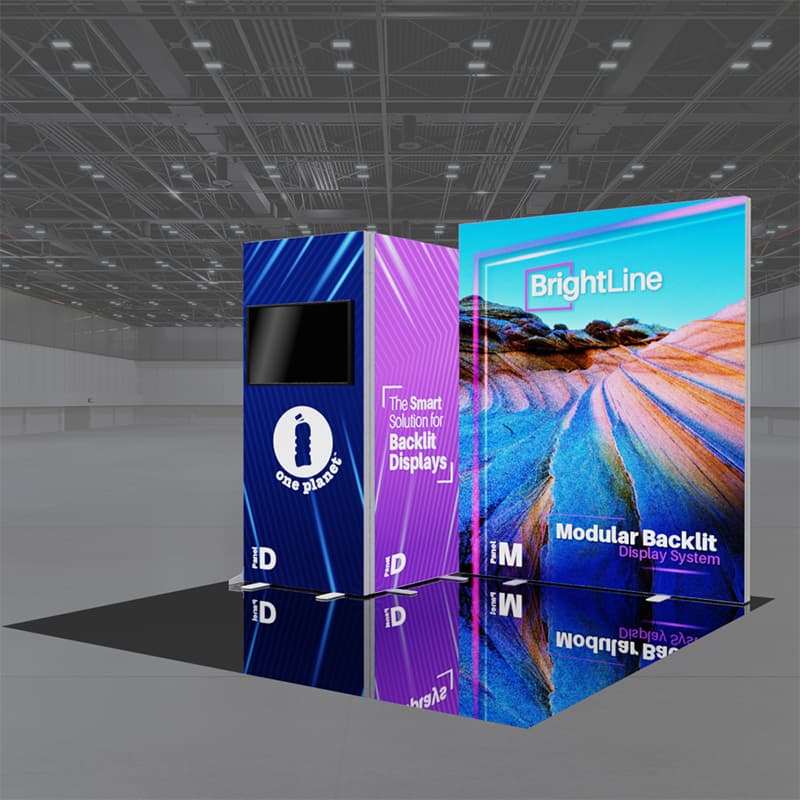 BrightLine Kits engage audiences with illuminated displays combining shapes and styles to create captivating exhibits. Kits include hardware, graphics, connectors, and extension cables to reach a single power source location. Each panel is packed in a custom-foamed shipping case. The 10-DDM kit captures attention with a dual depth layout, while also providing a convenient storage zone within its 10ft exhibition space. Elevate the branding experience with double-sided graphics, or adding accessories like TV mounts, counters, and shelving. Panels can also be replaced with matching options from WaveLine and StraightLine display systems, contact our team for details.