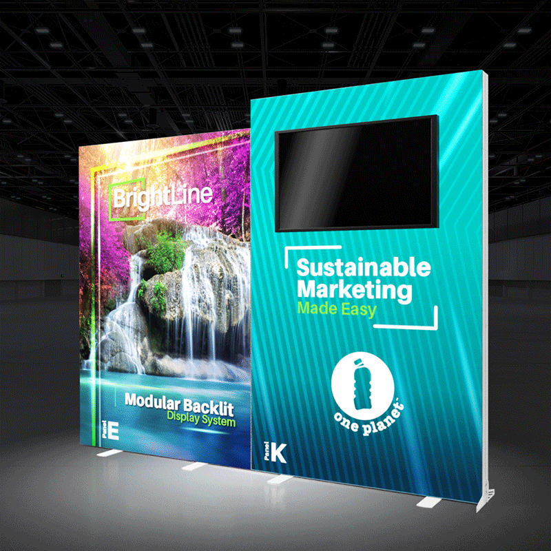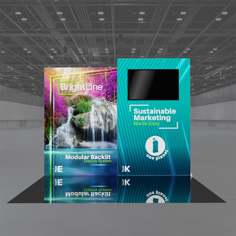 BrightLine Kits engage audiences with illuminated displays combining shapes and styles to create captivating exhibits. Kits include hardware, graphics, connectors, and extension cables to reach a single power source location. Each panel is packed in a custom-foamed shipping case. The 10-EK Kit packs double-duty as a 10ft exhibit or two individual 5ft displays. By combining two distinct heights, this design achieves an eye-catching movement that compliments any branding. Elevate the branding experience with double-sided graphics, or adding accessories like TV mounts, counters, and shelving. Panels can also be replaced with matching options from WaveLine and StraightLine display systems, contact our team for details.