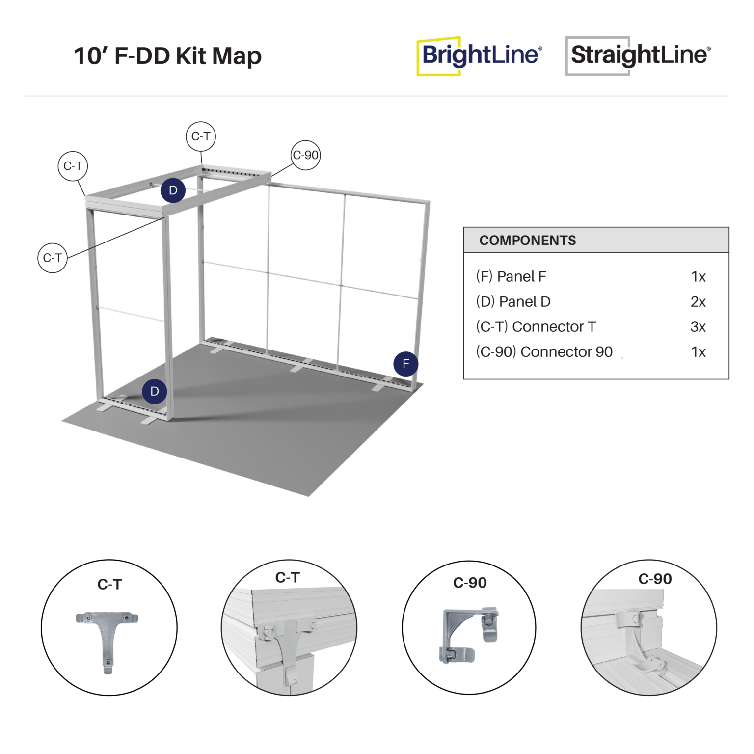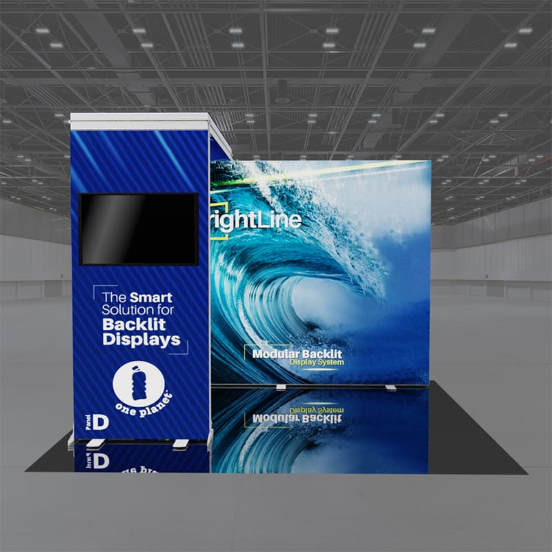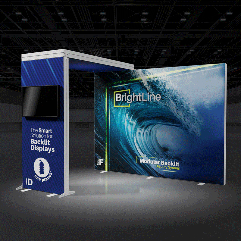 BrightLine Kits engage audiences with illuminated displays combining shapes and styles to create captivating exhibits. Kits include hardware, graphics, connectors, and extension cables to reach a single power source location. Each panel is packed in a custom-foamed shipping case. The 10-F-DD kit features a striking backlit bridge, to elevate the popular 10ft booth into an interactive brand ambassador. Elevate the branding experience with double-sided graphics, or adding accessories like TV mounts, counters, and shelving. Panels can also be replaced with matching options from WaveLine and StraightLine display systems, contact our team for details.