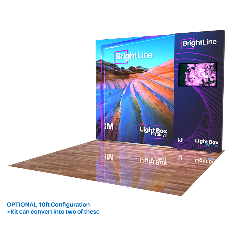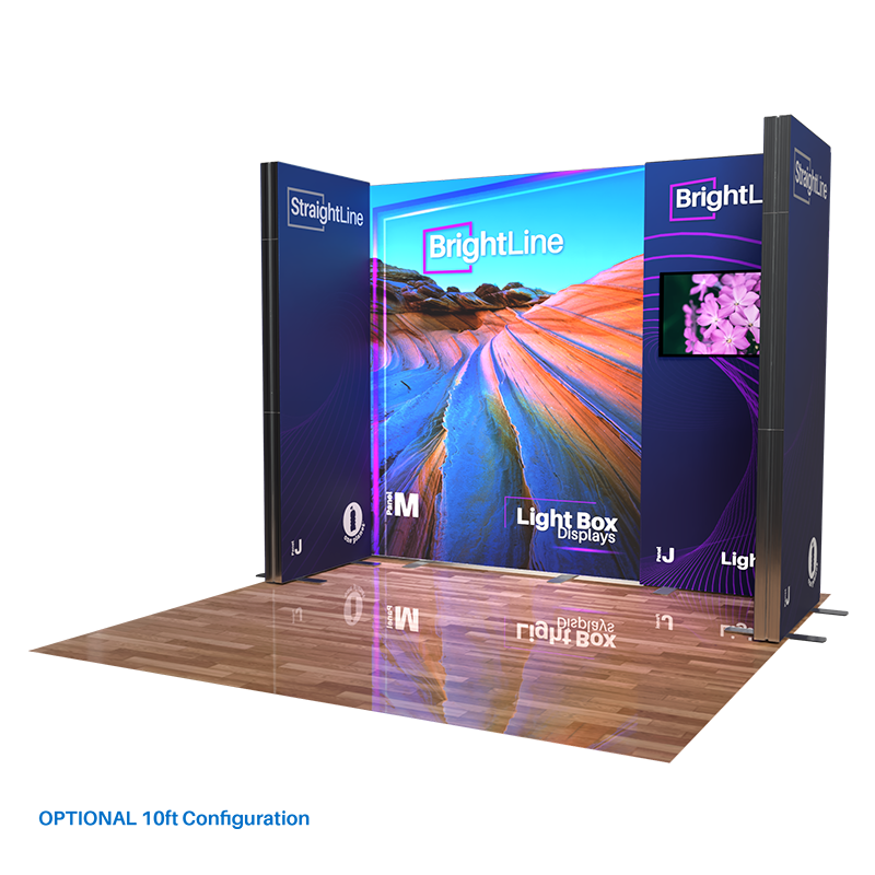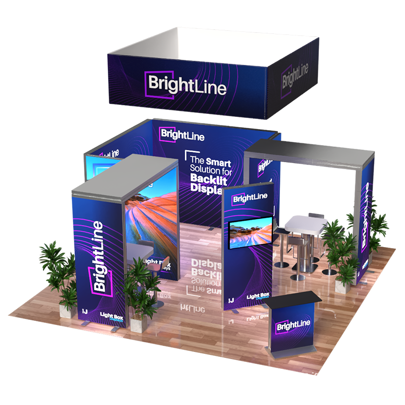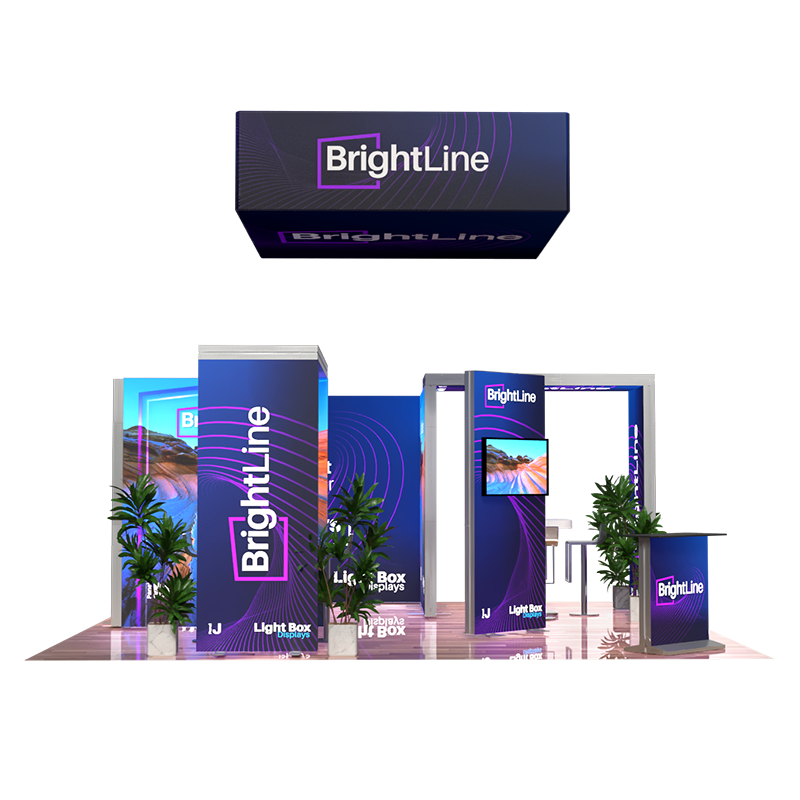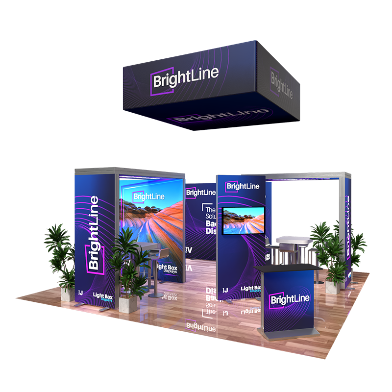 The BrightLine Island Kit 10 is expertly designed to create a striking and highly functional 20ft island booth, optimizing both visibility and visitor interaction. This kit features a private nook ideal for meetings or product demonstrations that require a more secluded space. From this private corner, two bridges extend to form two additional semi-private spaces, perfect for engaging with visitors in a more relaxed setting. A 10ft hanging sign with a graphic bottom adds a striking overhead visual, ensuring the booth stands out from a distance while reinforcing brand visibility from all angles. A modern illuminated counter provides a natural entry point, inviting attendees to explore the networking or lounge spaces. This kit also includes a TV monitor kit, ensuring dynamic video presentations and interactive experiences. BrightLine: Where your brand’s brilliance comes to life!
