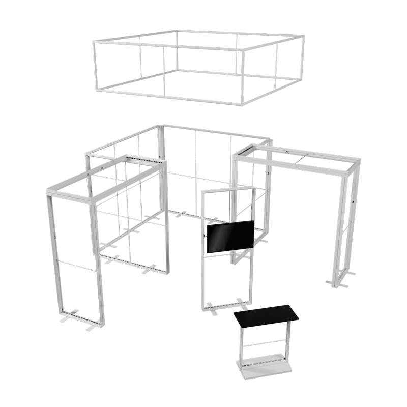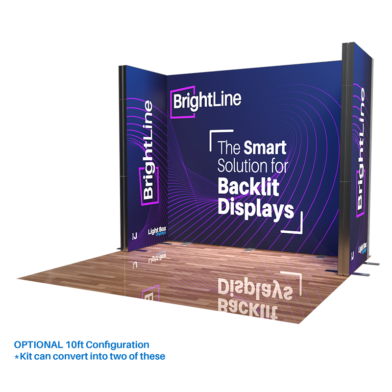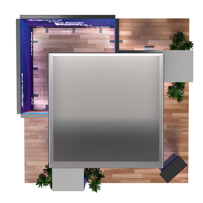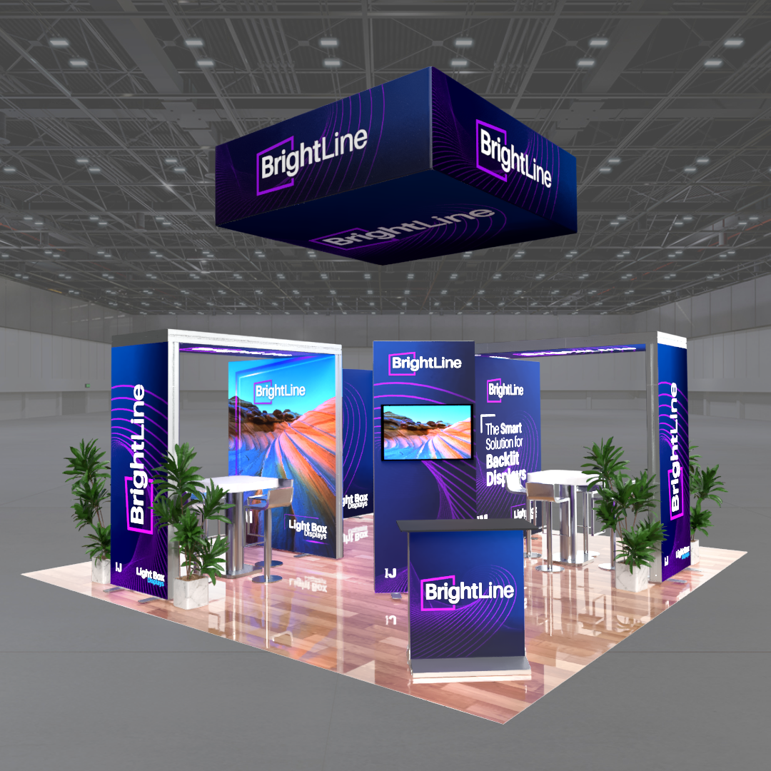 The BrightLine Island Kit 10 is expertly designed to create a striking and highly functional 20ft island booth, optimizing both visibility and visitor interaction. This kit features a private nook ideal for meetings or product demonstrations that require a more secluded space. From this private corner, two bridges extend to form two additional semi-private spaces, perfect for engaging with visitors in a more relaxed setting. A 10ft hanging sign with a graphic bottom adds a striking overhead visual, ensuring the booth stands out from a distance while reinforcing brand visibility from all angles. A modern illuminated counter provides a natural entry point, inviting attendees to explore the networking or lounge spaces. This kit also includes a TV monitor kit, ensuring dynamic video presentations and interactive experiences. BrightLine: Where your brand’s brilliance comes to life!
