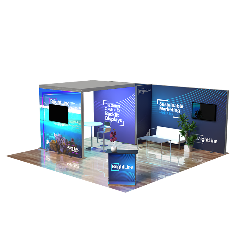 Our Island Booth Kits harness the synergy of StraightLine displays and BrightLine lightboxes, creating impressive and dynamic exhibitions. With a 360-degree exposure, these 20ft-by-20ft configurations entice visitors with eye-catching graphics printed on 100% recycled One Planet fabric. Kits are bundled with hardware, graphics, connectors, TV mounts and extension cables. Each panel is packed in within molded-foam inserts in a heavy-duty shipping case.