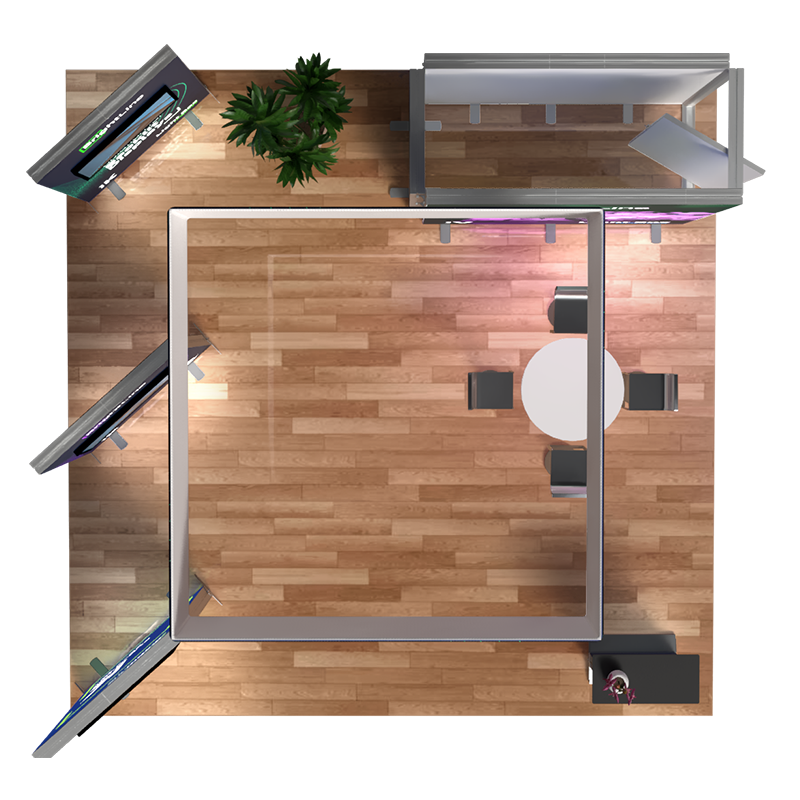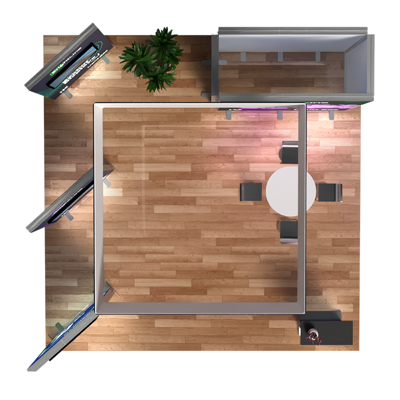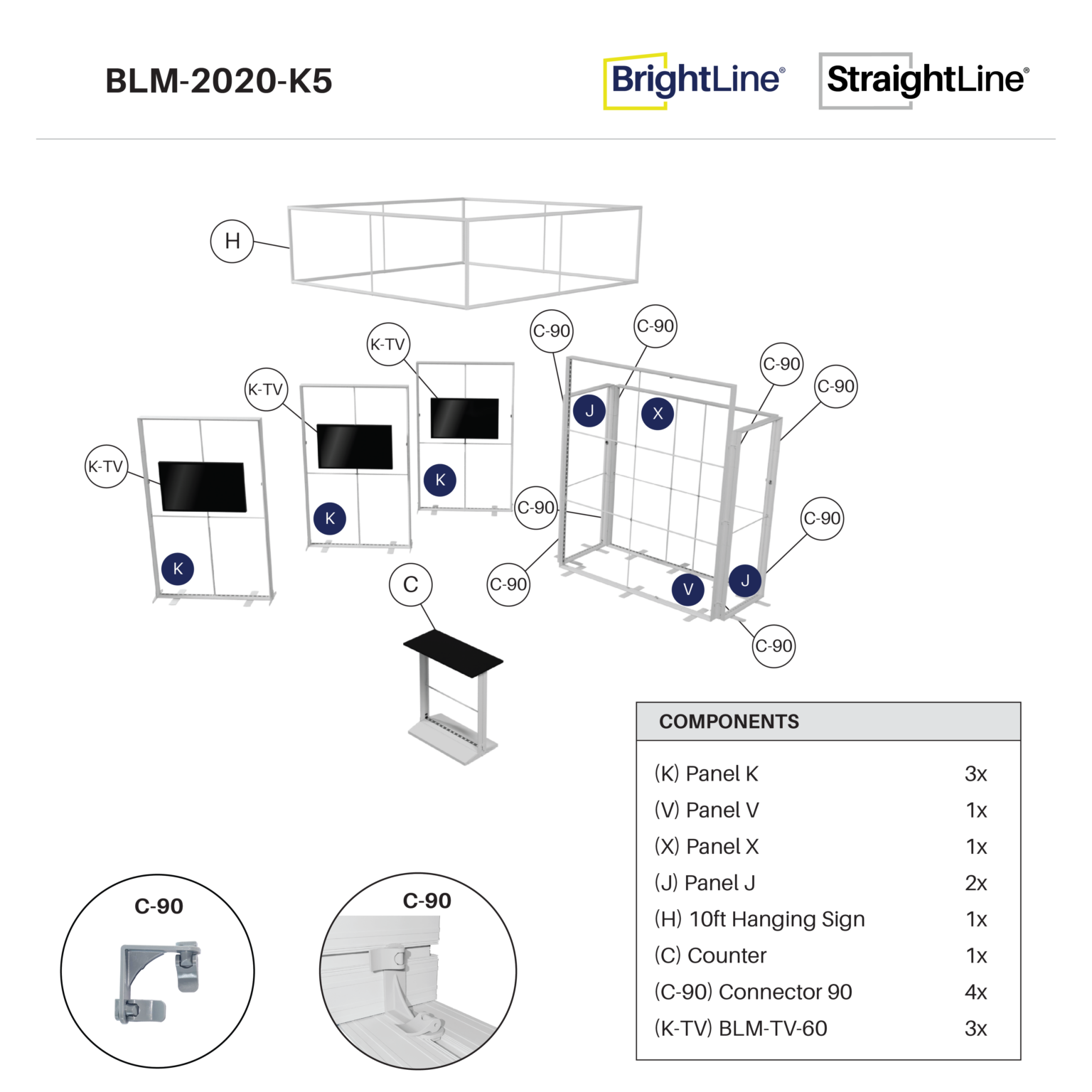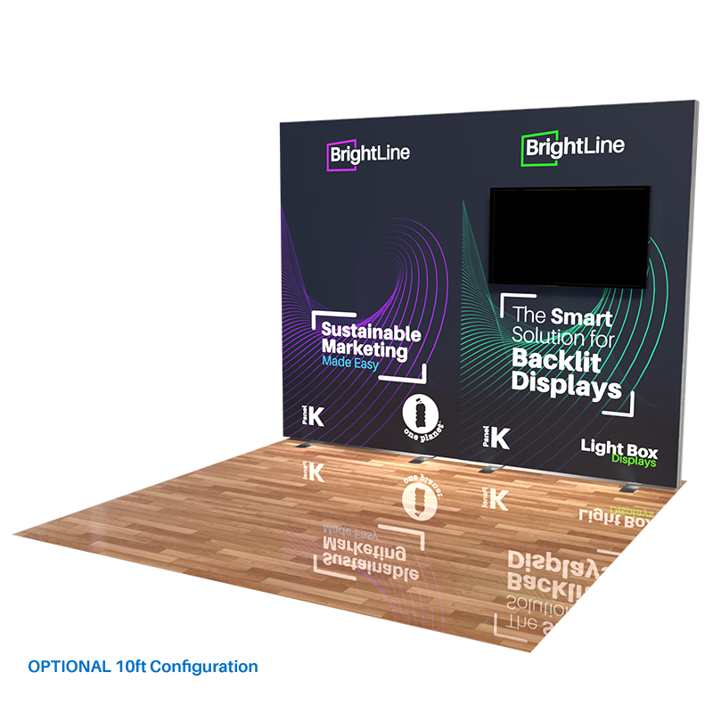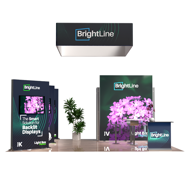 The BrightLine Island Kit 5 boosts an attention-grabbing 20ft layout designed for multiple kiosk presentations . The three BrightLine K Panels are cleverly angled for a balanced design, each accented with its own TV mount kit and offering the ability of multiple dynamic video presentations. Adding to the appeal, two StraightLine J Panels are strategically placed between the BrightLine V Panel and BrightLine X Panel to form a convenient storage space. The backlit counter serves as a perfect welcome point to introduce visitors to a spacious area, ideal for product demonstrations or a comfortable meeting place. Unifying everything together, the 10ft hanging sign increases visibility from afar. This 20ft exhibit offers flexibility like no other, easily converting into a 10ft booth or 5ft showcases! Elevate the branding scene with BrightLine.
