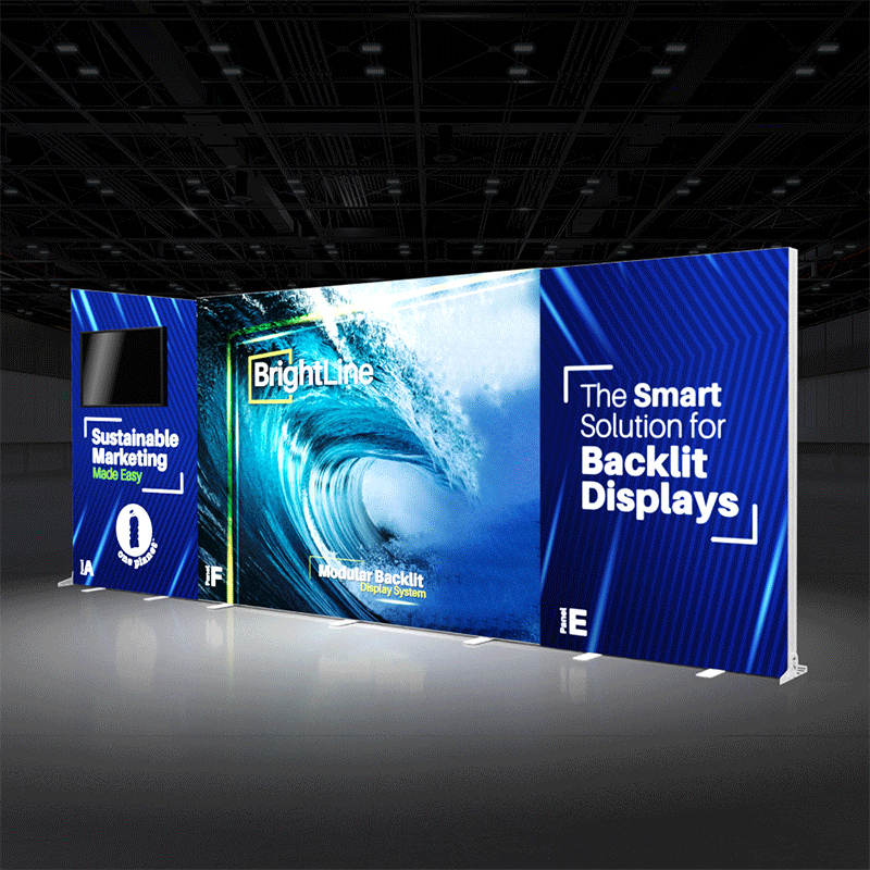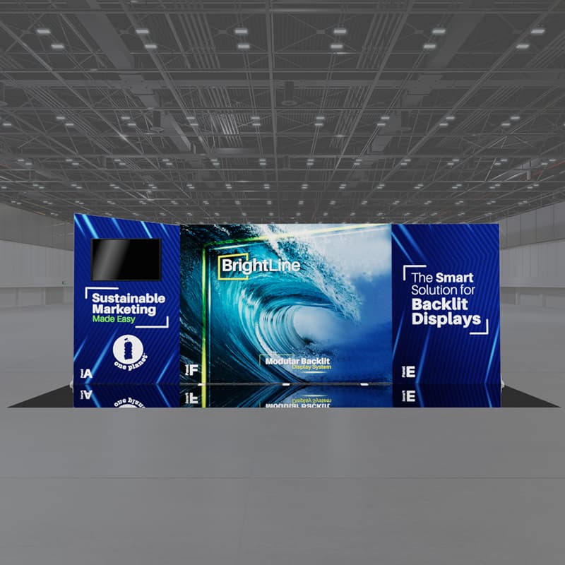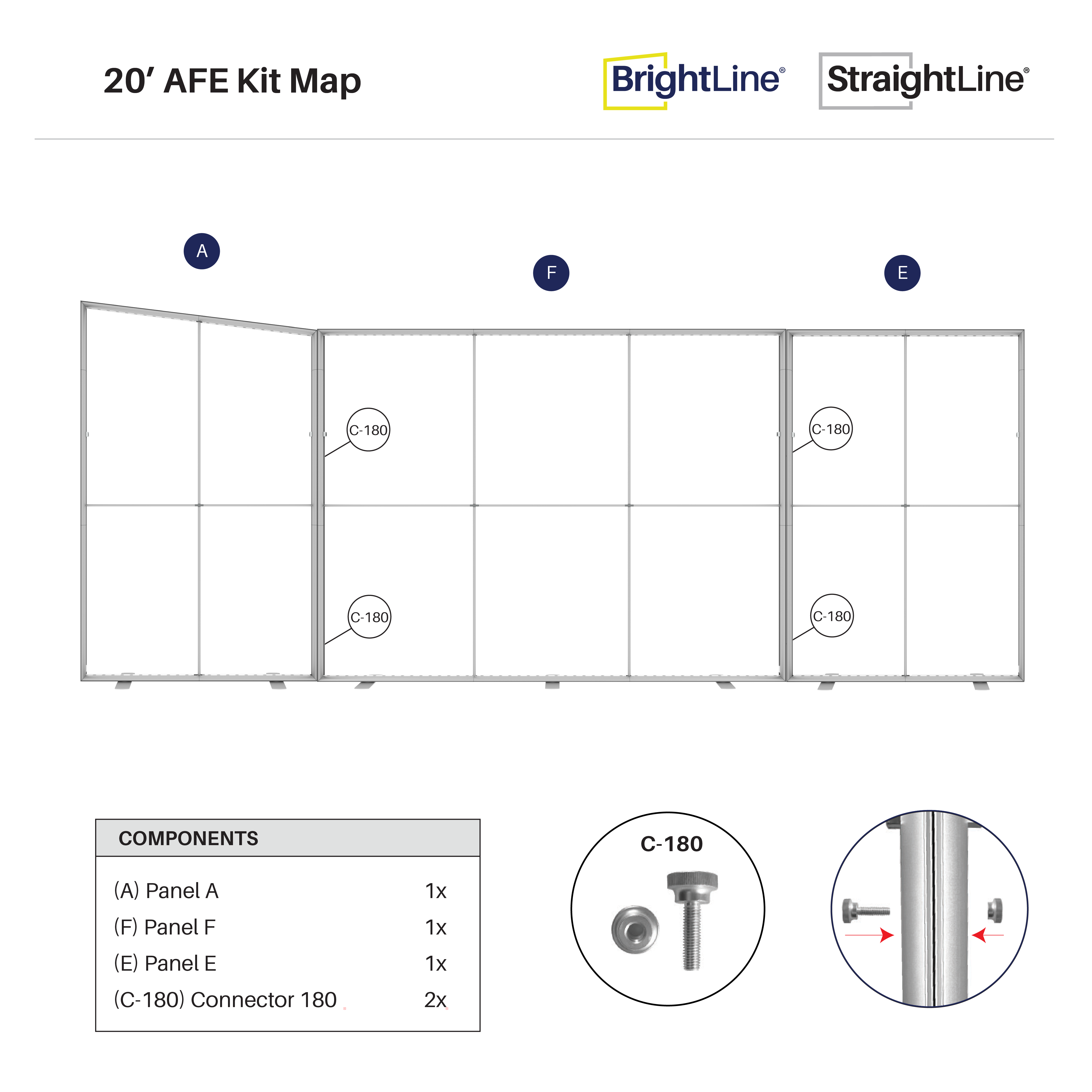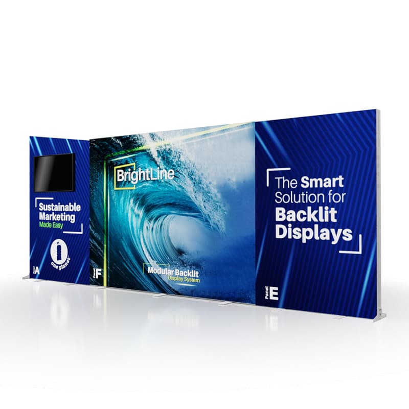 BrightLine Kits engage audiences with illuminated displays combining shapes and styles to create captivating exhibits. Kits include hardware, graphics, connectors, and extension cables to reach a single power source location. Each panel is packed in a custom-foamed shipping case. The 20-AFE kit presents an eye-catching layout with the strategic placement of the angled A panel, for an enthralling 20ft exhibition. This convertible booth turns into two exquisite 10ft displays. Elevate the branding experience with double-sided graphics, or adding accessories like TV mounts, counters, and shelving. Panels can also be replaced with matching options from WaveLine and StraightLine display systems, contact our team for details.