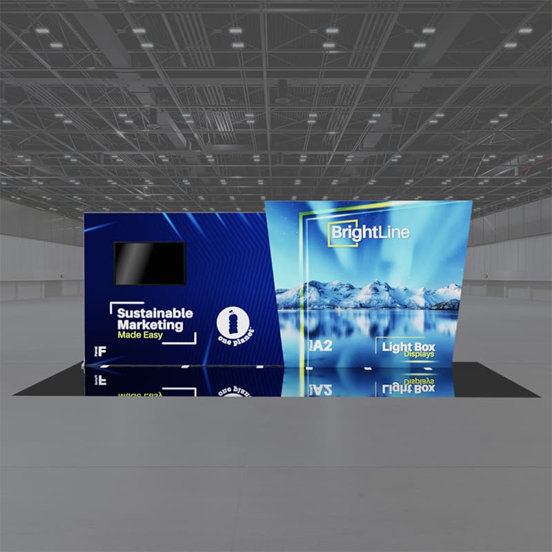 BrightLine Kits engage audiences with illuminated displays combining shapes and styles to create captivating exhibits. Kits include hardware, graphics, connectors, and extension cables to reach a single power source location. Each panel is packed in a custom-foamed shipping case. Kit 20-FA2 is accented with A2’s appealing trapezoid design, creating a unique look that is sure to turn heads. This convertible booth turns into two exquisite 10ft displays. Elevate the branding experience with double-sided graphics, or adding accessories like TV mounts, counters, and shelving. Panels can also be replaced with matching options from WaveLine and StraightLine display systems, contact our team for details.