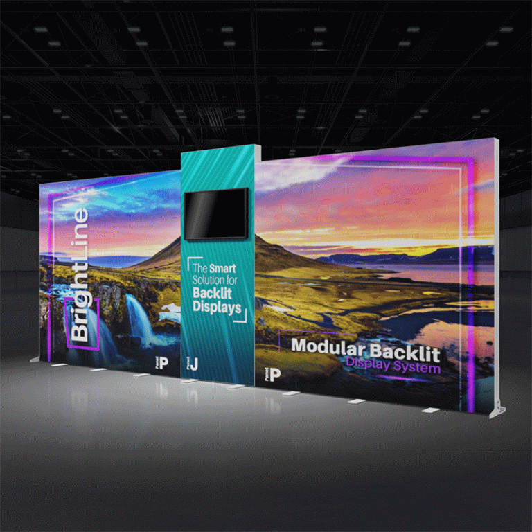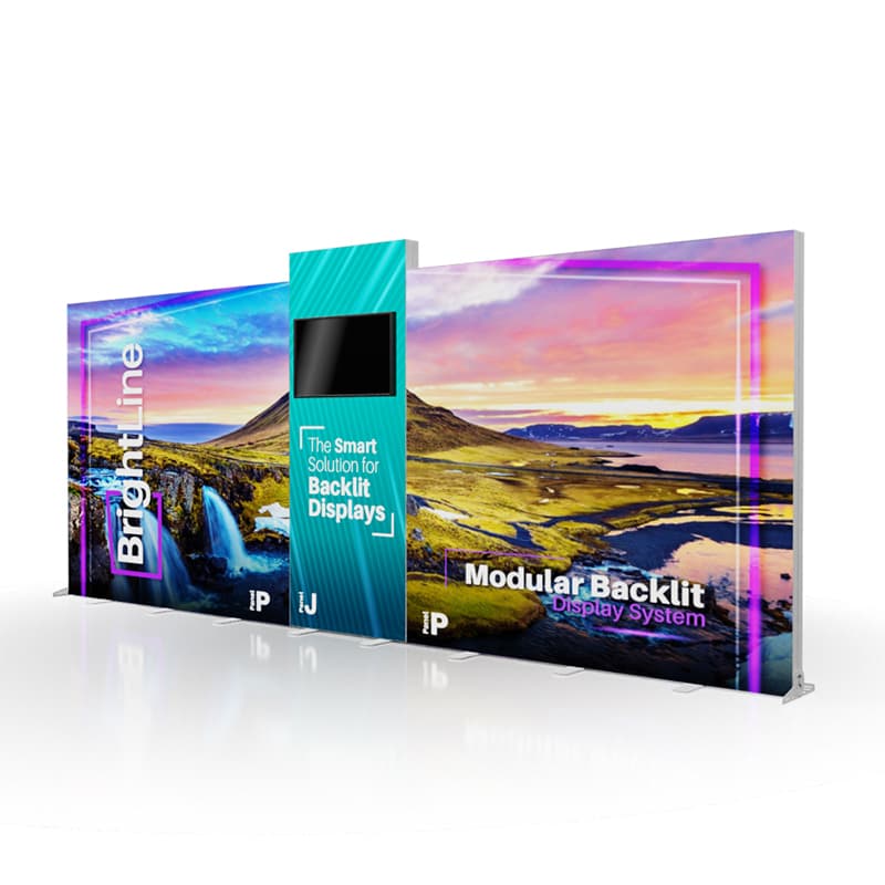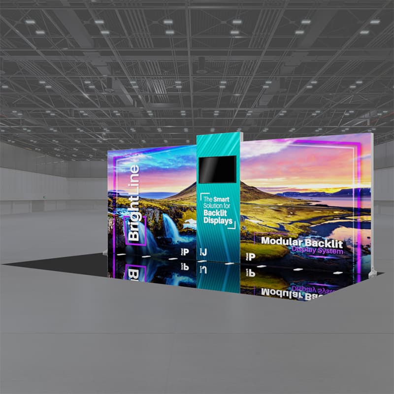 BrightLine Kits engage audiences with illuminated displays combining shapes and styles to create captivating exhibits. Kits include hardware, graphics, connectors, and extension cables to reach a single power source location. Each panel is packed in a custom-foamed shipping case. In this kit, the tiered structure of the panels results in a remarkably crafted 20ft booth with lots of movement and appeal, perfect for brands looking for dual branding or a separate demo area. Elevate the branding experience with double-sided graphics, or adding accessories like TV mounts, counters, and shelving. Panels can also be replaced with matching options from WaveLine and StraightLine display systems, contact our team for details.